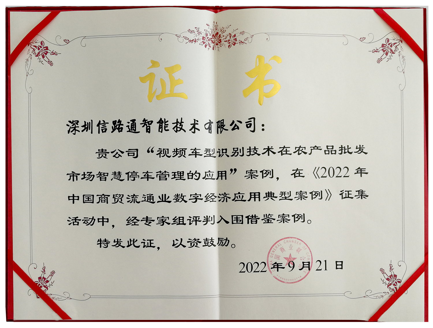 中國商業(yè)聯(lián)合會為切實(shí)貫徹國家促進(jìn)數(shù)字經(jīng)濟(jì)發(fā)展戰(zhàn)略規(guī)劃,挖掘商貿(mào)流通業(yè)中數(shù)字經(jīng)濟(jì)在新技術(shù)、新場景等方面的典型應(yīng)用做法,開展典型案例的評選活動(dòng),經(jīng)由行業(yè)專家、學(xué)者組成的專家組在創(chuàng)新性、可操行性、商業(yè)模式、技術(shù)含量、發(fā)展空間等五個(gè)方面的綜合研判,信路通“視頻車型識別技術(shù)在農(nóng)產(chǎn)品批發(fā)市場智慧停車管理的應(yīng)用”案例入選。